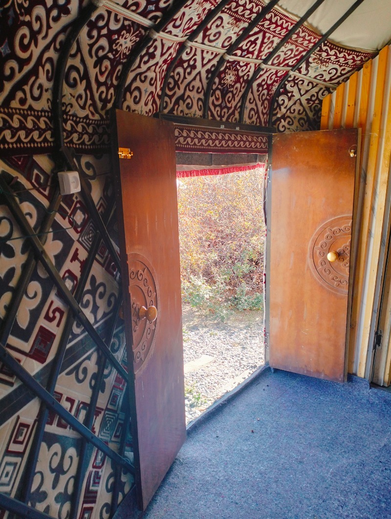Юрта сочетает традиционные материалы (войлок, дерево, брезент) с современными решениями (стеклянные двери, лак, пропитка для дерева).